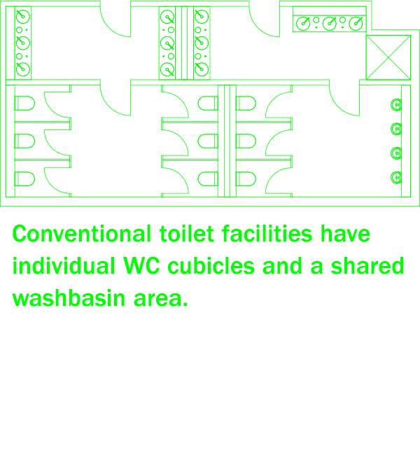 For the same number of WCs, the PSS™ modules require no more space than a conventional toilet facility with individual cubicles and a shared washbasin area.